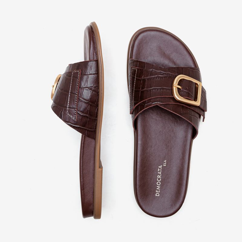 A Rasteira de couro feminina Linha Zoe Democrata combina simplicidade e elegância em um design atemporal. Com uma fivela metálica em formato de "D" na parte superior, carrega a assinatura da marca de forma sutil e refinada. O solado em TR garante leveza e aderência, ideal para quem busca conforto e versatilidade nos dias mais quentes.